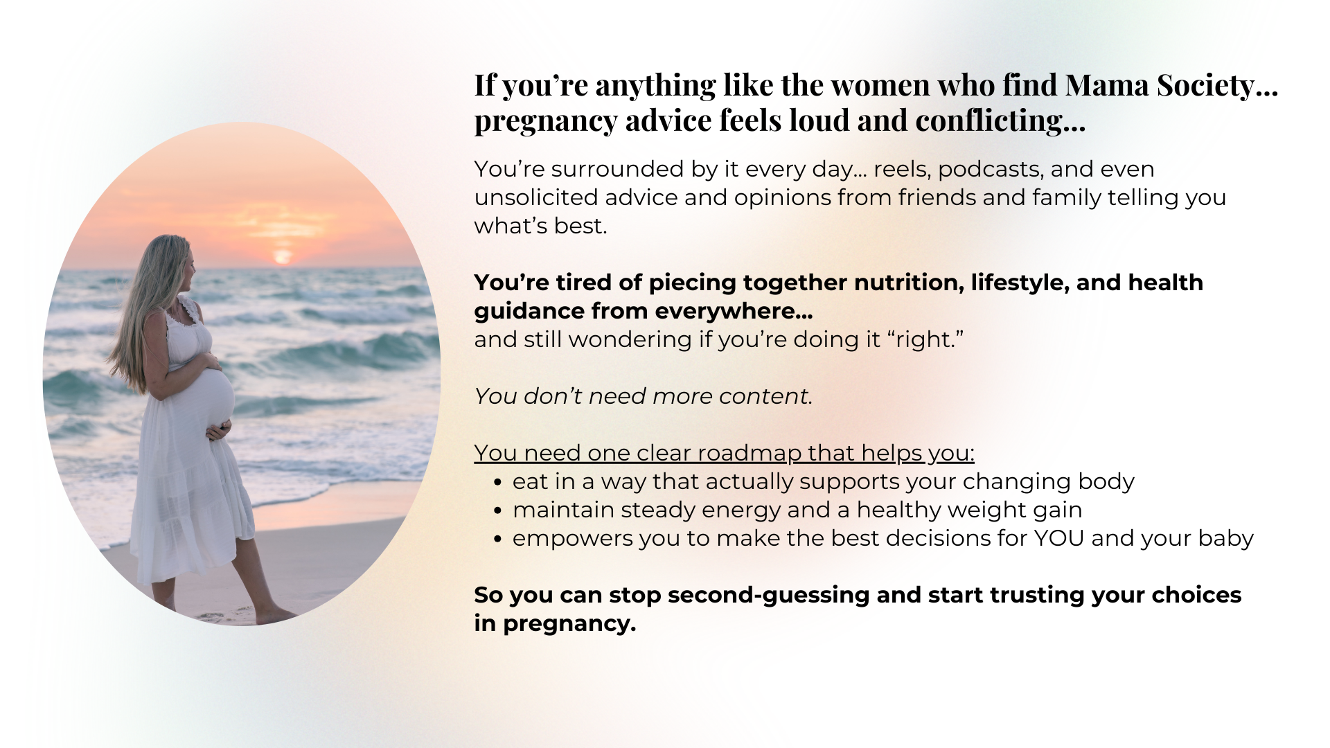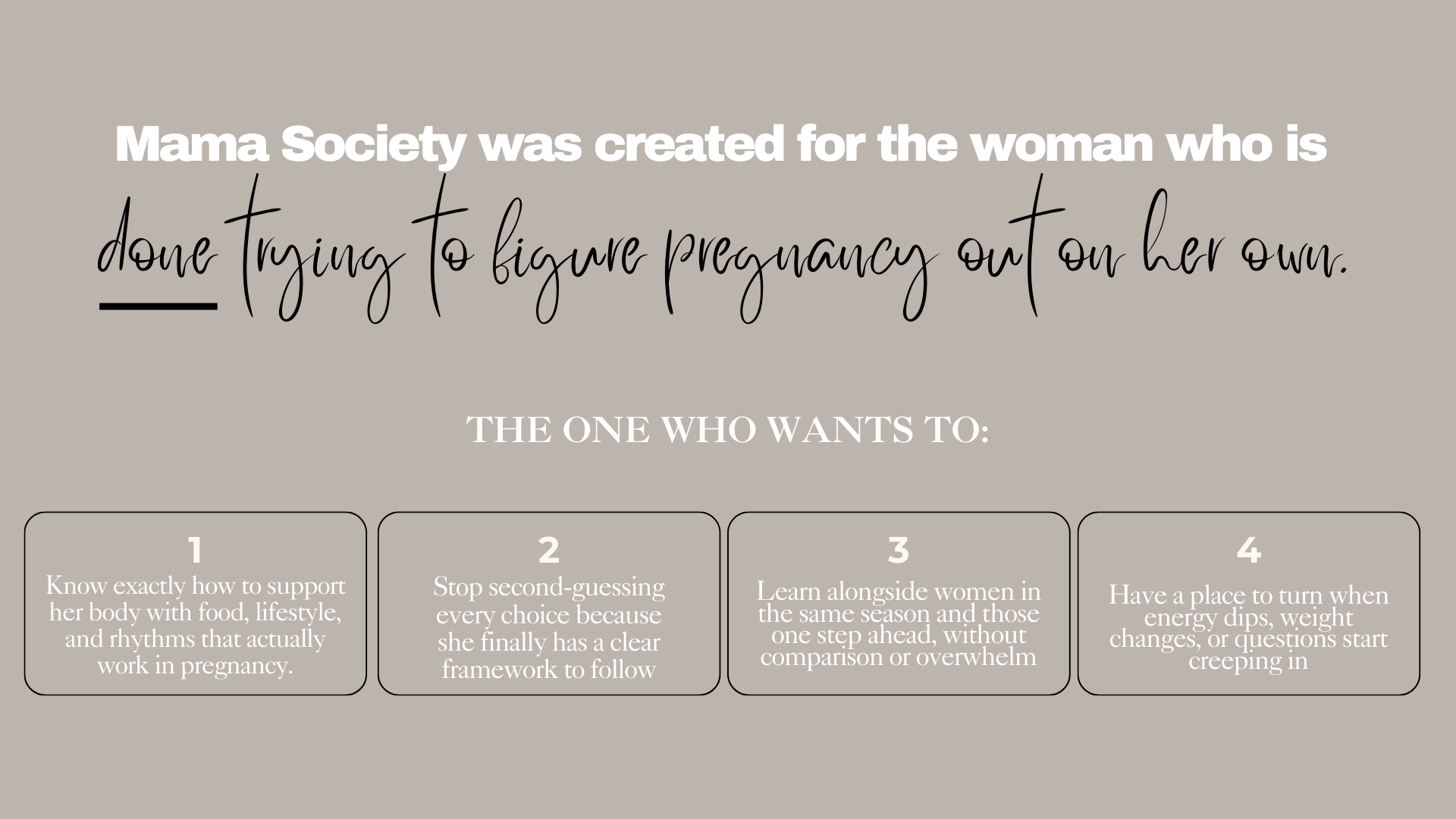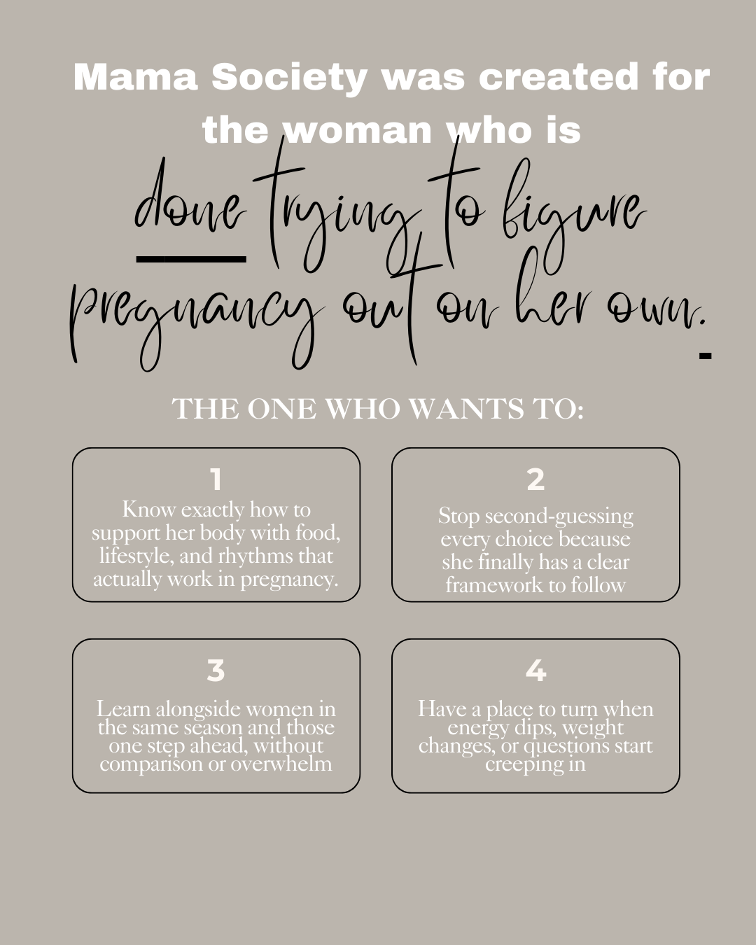 Mama Society is your clear, step-by-step roadmap for trying to conceive, pregnancy, and postpartum, so you know exactly how to support your body and make confident decisions at every stage.