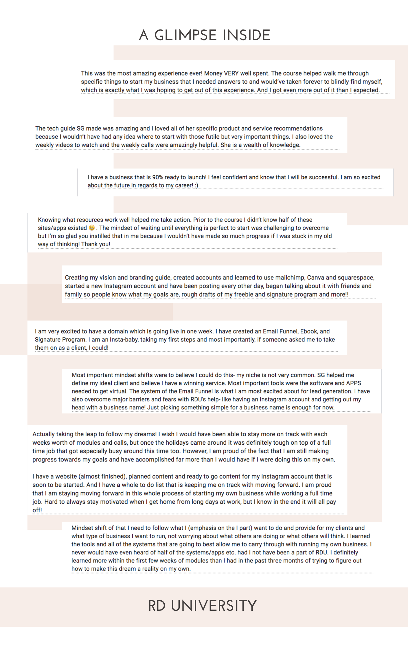 Even though it is set up in an 8-module, 8-week format, RD University can be done at your pace! You’ll have access to all modules at once in case you have extra time on some weeks, and little to no time on others. All past recorded group calls will be available too. However if wanting to complete within the 8-week timeframe, building a business DOES take some work :) I recommend setting aside about an hour to watch the lessons of the week, and another 2-3 hours to implement and take serious action from what you learned. Plus, I know once you start the beginning process and create those clear goals and visions, you’ll be so excited you won’t be able to help but to dedicate time to this weekly!